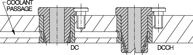 Directed-Coolant Bushings, shown in Figure 10-37 are also like the SF renewable bushings. Directed-coolant bushings, type DC, come with coolant passages machined into the bushings to direct the coolant flow to the cutting area. This design both cools the cutting tool and washes away the accumulated chips.