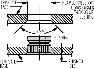 Template bushings are installed with an installation tool. When locating template bushings, follow the minimum edge distances and hole spacings shown in Figure 10-10(a). Once properly located, the mounting hole is drilled and reamed .001” to .003” larger than the mounting diameter of the bushing. The hole is countersunk on the workpiece side, allowing the bushing to sit .015” below the surface, Figure 10-10(b). The bushing is then inserted and pressed into the hole. Here are a few best practices for installing template bushings: