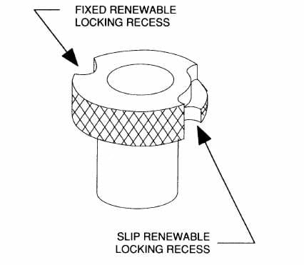 Slip/fixed Renewable Bushings, types SF and SFC (carbide), are the most common form of renewable bushings. This renewable bushing replaces the older and obsolete slip renewable, type S, and fixed renewable, type F, bushings, combining the slip and fixed locking arrangements in a single bushing. One part of the bushing setup is fixed, serving as a holder or liner, while the other part, the actual bushing, can slip into and out of this holder.