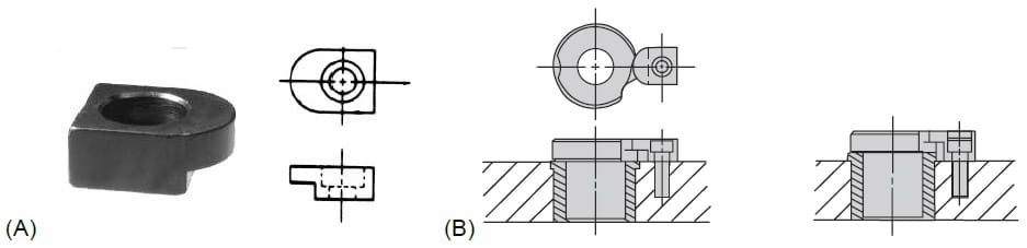 Renewable bushings are typically held in the jig plate with a lockscrew or a clamp. The lockscrew or clamp radially locates the bushing in the liner and holds the bushing in place. The lockscrew, shown in Figure 10-21(a), is the most common locking device. These screws generally mount the bushings on either their slip-renewable or fixed-renewable sides. They are made with a shoulder under the head. For mounting bushings on their slip-renewable side, the shoulder provides the necessary clearance to rotate the bushing for installation and removal. When mounted on the fixed-renewable side, the underside of the head securely holds the bushing in place.