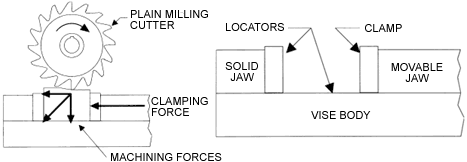 The relationship between the locators and clamps can be illustrated with a milling-machine vise. As shown above, the vise contains both locating and clamping elements. The solid jaw and vise body are the locators. The movable jaw is the clamp. The vise is normally positioned so that the locators resist the cutting forces. Directing the cutting forces into the solid jaw and vise body ensures the accuracy of the machining operation and prevents workpiece movement. In all workholders, it is important to direct the cutting forces into the locators. The movable vise jaw, like other clamps, simply holds the position of the workpiece against the locators.
