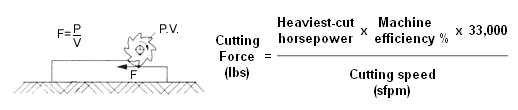Please note: "heaviest-cut horsepower" is not total machine horsepower; rather it is the maximum horsepower actually used during the machining cycle. Typical machine efficiency is roughly 75% (.75). The number 33,000 is a units-conversion factor. The above formula only calculates force magnitude, not direction. Cutting force can have x-, y-, and/or z-axis components. Force direction (and magnitude) can vary drastically from the beginning, to the middle, to the end of the cut.