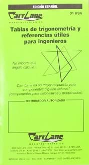Libro Trig (Tablas de trigonometría y referencias útiles para ingenieros) - consultará este libro de referencia una y otra vez. Contenido: equivalentes decimales, tamaño de rosca y tamaño de la broca para roscar en pulgadas y métricas, tamaño de broca estándar, agujeros escariados para tornillos cabeza allen en pulgadas y métricas, acabados de superficie, fuerza de sujeción de correas de sujetadores estándar en pulgadas y métricas, sistema de numeración básico para aceros, comparación de maquinabilidad de diversos metales, conversiones de dureza y fuerza de tensión, prefijos métricos, factores de conversión para unidades de medición y cálculos de trigonometría (incluyendo funciones de trigonometría, tríangulos rectángulos y triángulos oblicuos).
