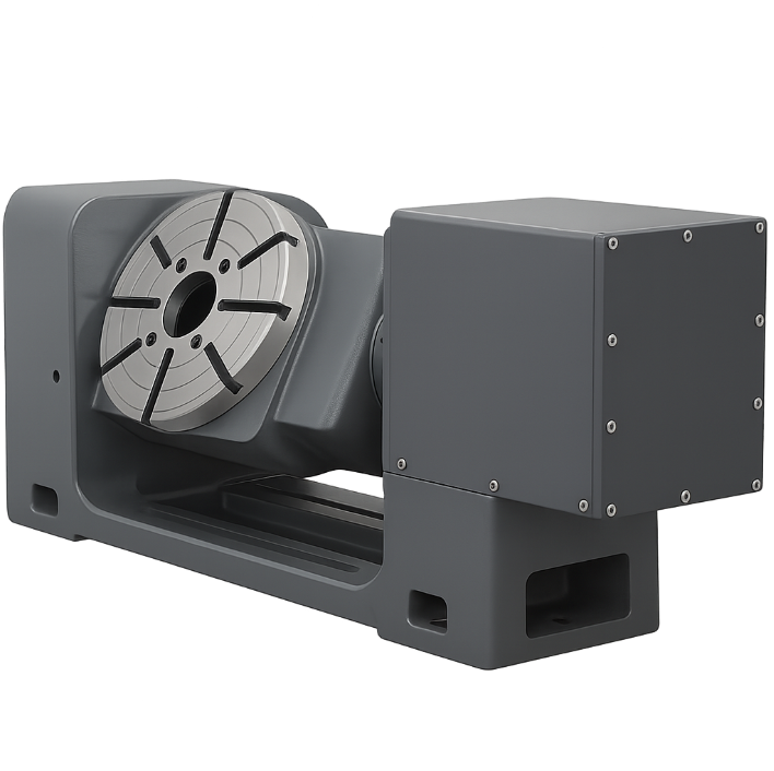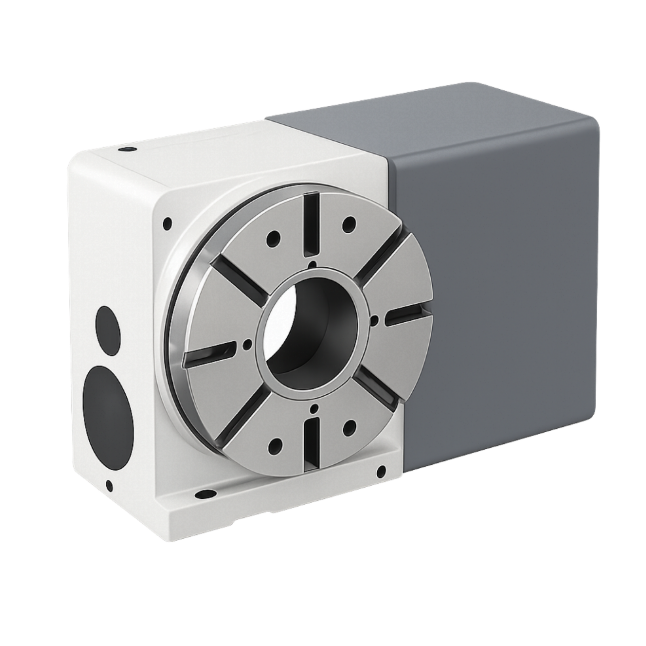 A single rotary indexer provides controlled rotation around one axis. It is used to position the workpiece at specific angles, then hold that angle during machining. The workpiece does not tilt, only rotates.